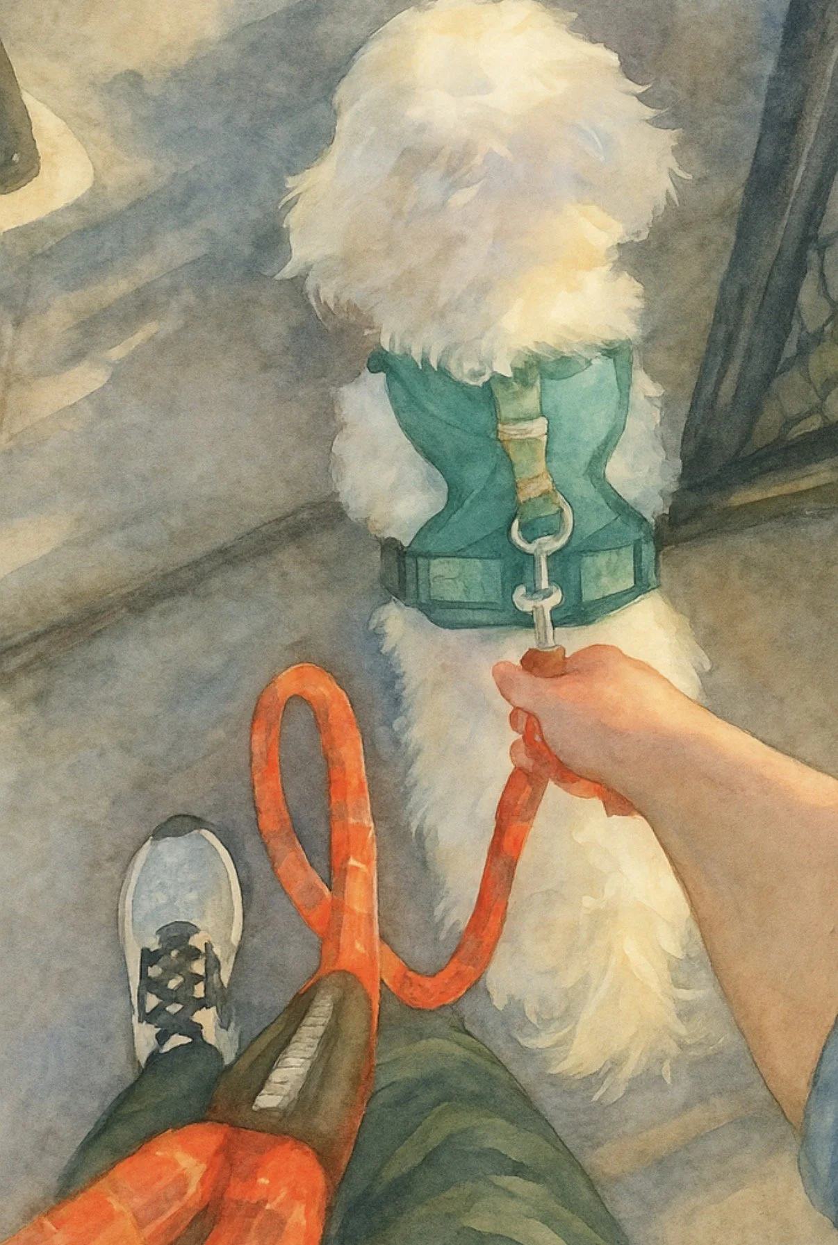 Relaxed neighborhood walk, fresh water, and a wellness check with real-time updates.